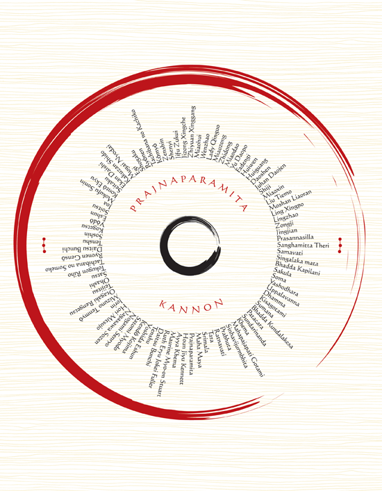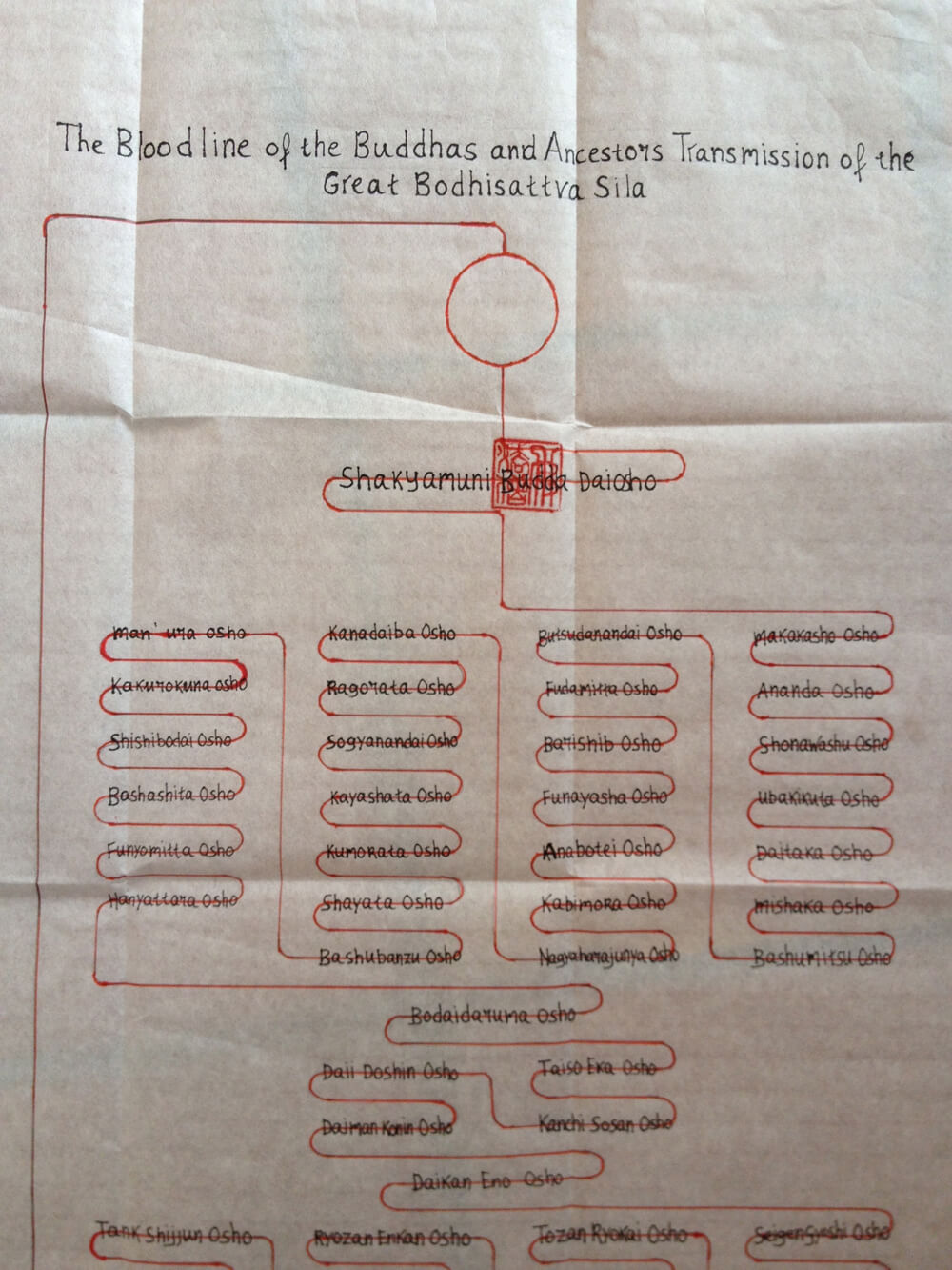 Hieronder zie je een deel van de kechimyaku, waarbij de rode lijn de bloedlijn symboliseert die door alle namen heen loopt. Helemaal bovenaan een lege cirkel die tevens Maha Prajna Paramita, de moeder van alle boeddha’s voorstelt. Daaronder staat Shakyamuni Boeddha, en via alle ancestors uit respectievelijk India, China en Japan loopt de opvolgingslijn via Maezumi Roshi bij de Westerse leraren met rechts onderaan Irène Kaigetsu Roshi met daarboven haar leraar Joan Jiko Halifax Roshi. Als je jukai ontvangt, kopieer je als onderdeel van de voorbereidingen deze lineage en komt je naam onder die van Roshi te staan. Zo gaat de bloedlijn door, tot en met jou, en – als je ooit ‘Dharma transmissie’ krijgt – vanaf jou weer verder… En terug naar de lege cirkel bovenaan.